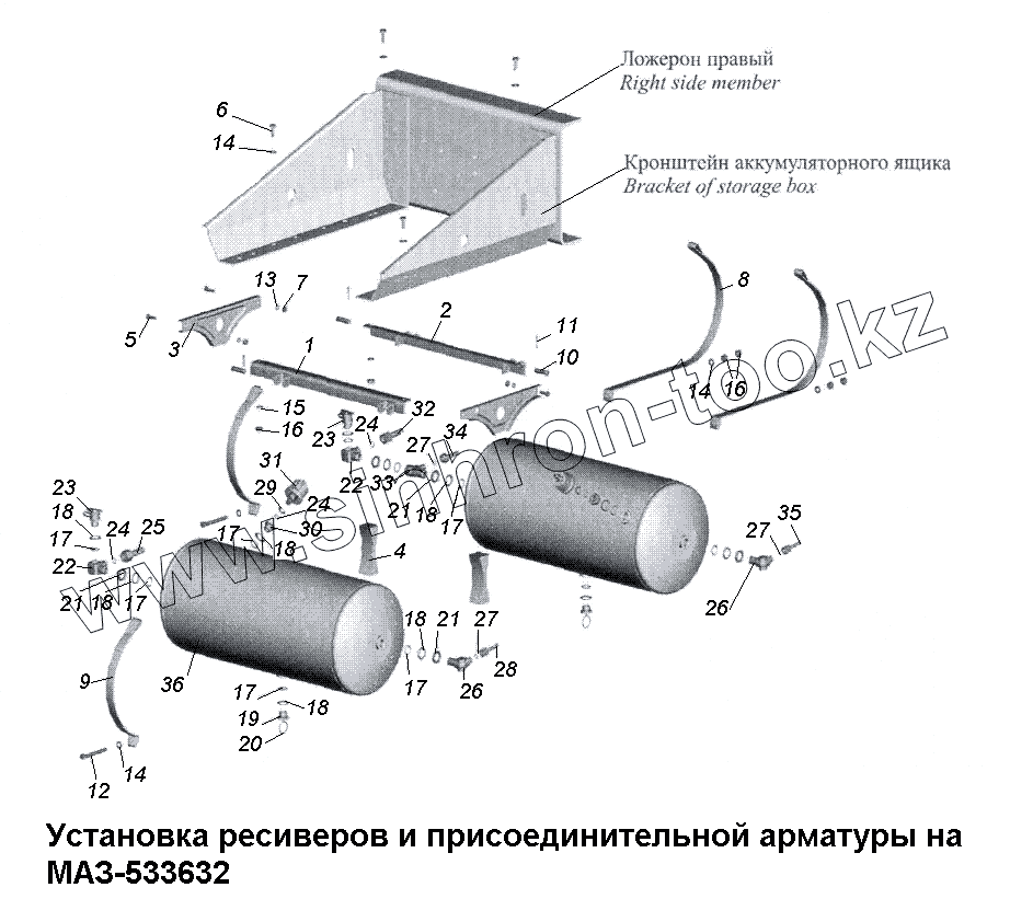 Каталог запасных частей к технике: МАЗ-533731. Установка ресиверов и присоединительной арматуры МАЗ-533632