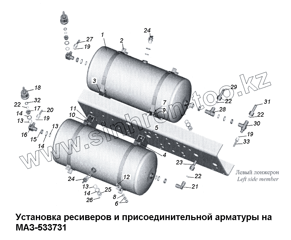 Каталог запасных частей к технике: МАЗ-533731. Установка ресиверов и присоединительной арматуры МАЗ-533731