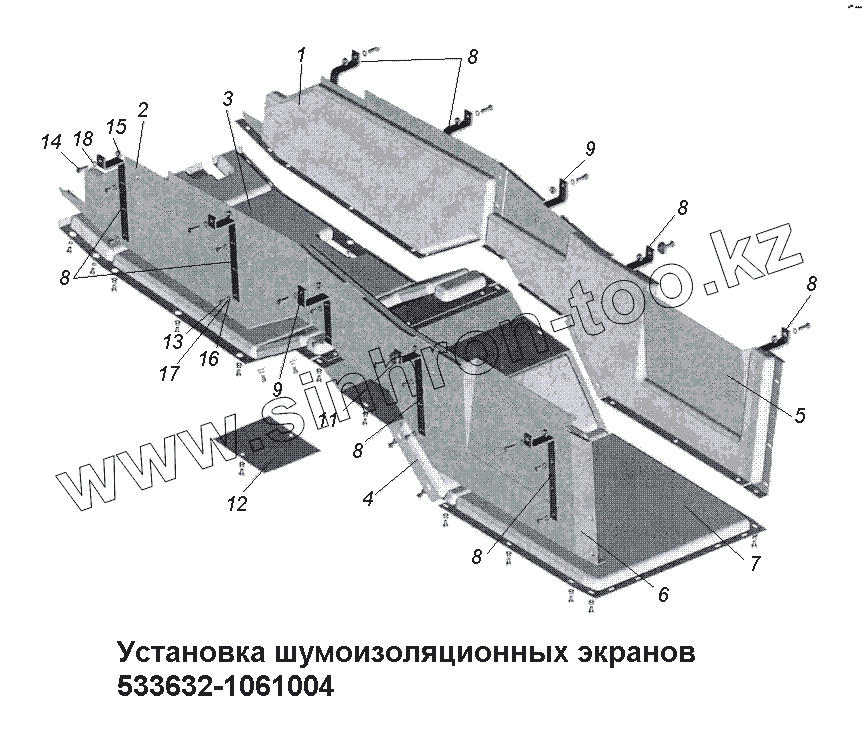 Каталог запасных частей к технике: МАЗ-533731. Установка шумоизоляционных экранов 533632-1061004