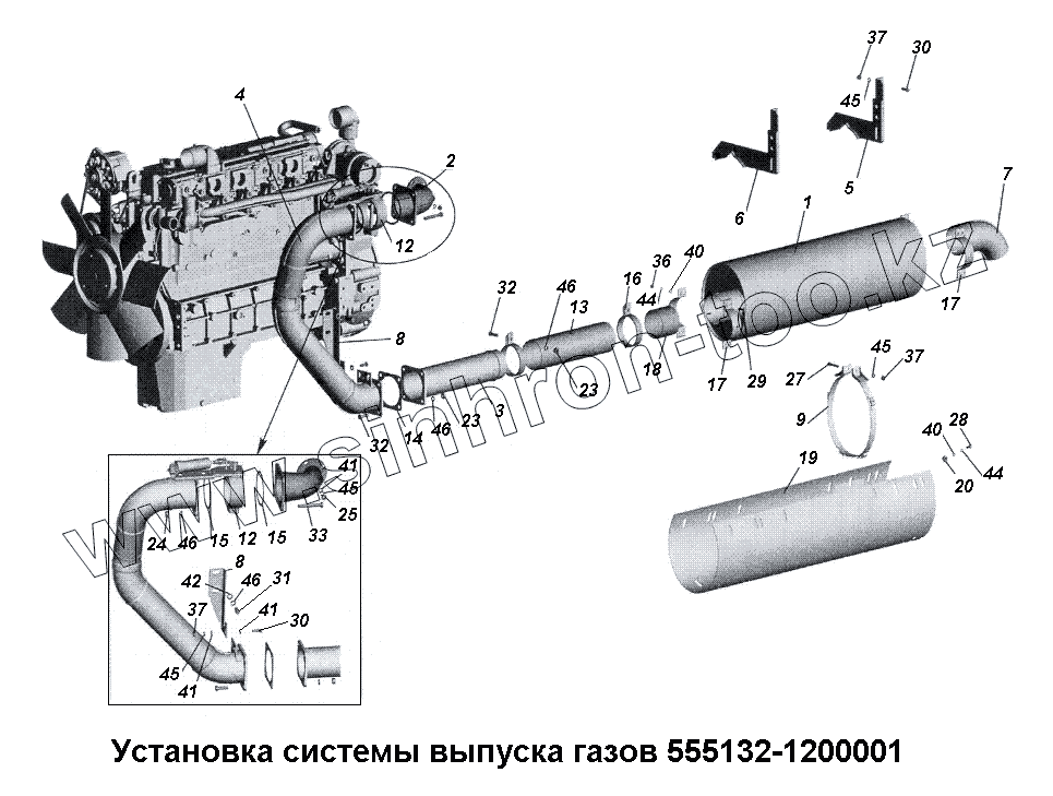 Каталог запасных частей к технике: МАЗ-533731. Установка системы выпуска газов 555132-1200001