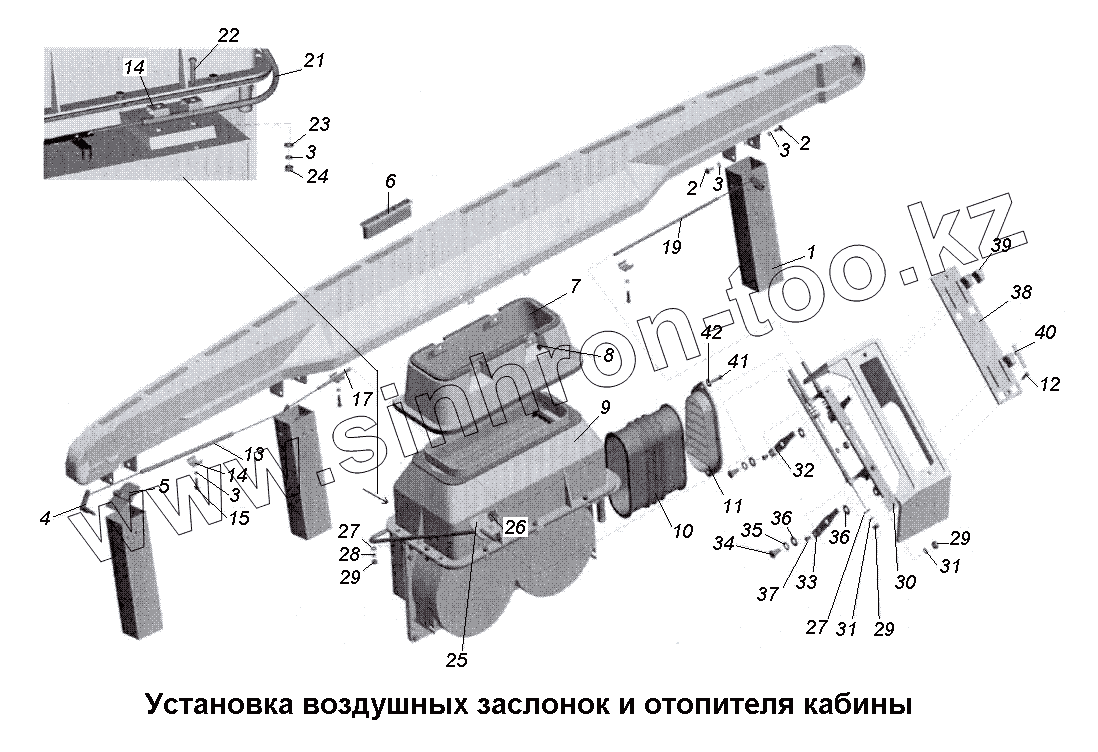Каталог запасных частей к технике: МАЗ-533731. Установка воздушных заслонок и отопителя кабины