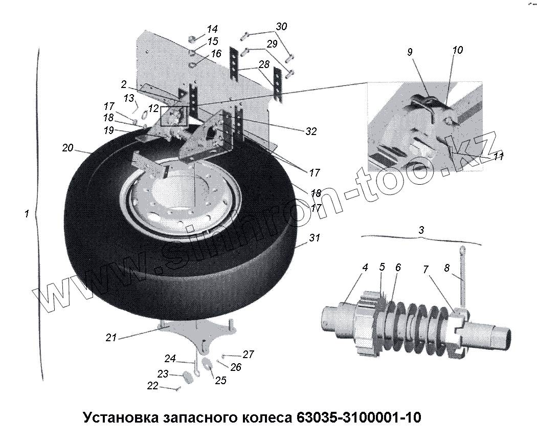 Каталог запасных частей к технике: МАЗ-533731. Установка запасного колеса 63035-3100001-10