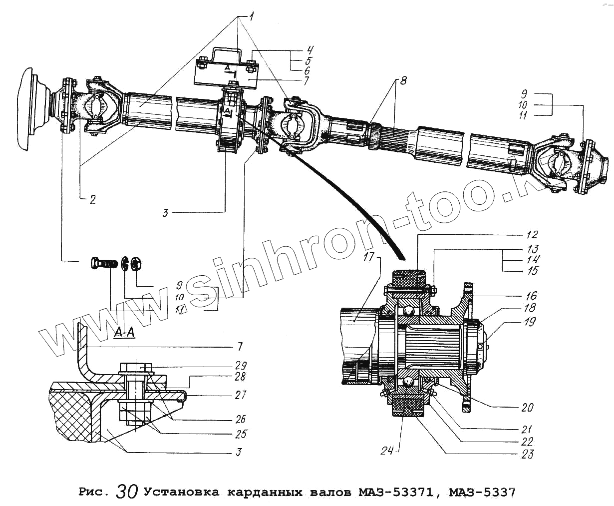 Каталог запасных частей к технике: МАЗ-5337. Установка карданных валов МАЗ-53371, МАЗ-5337