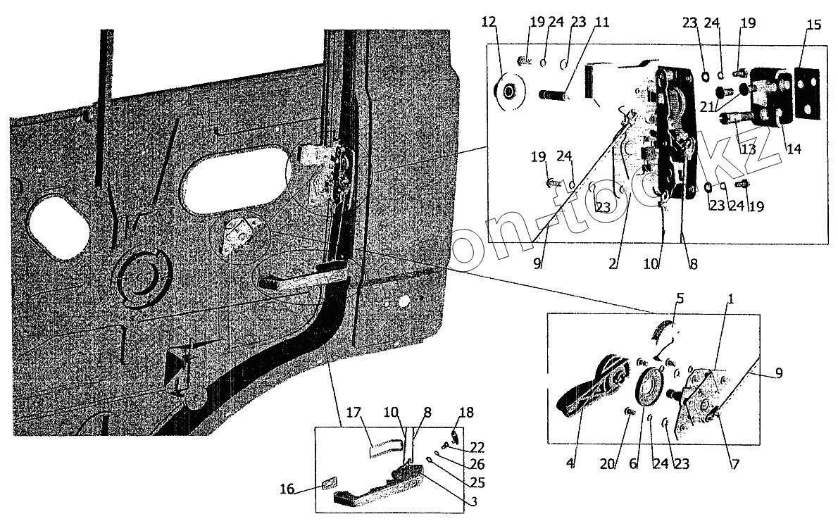 Каталог запасных частей к технике: МАЗ-5337 (2005). Установка наружной ручки и замка двери