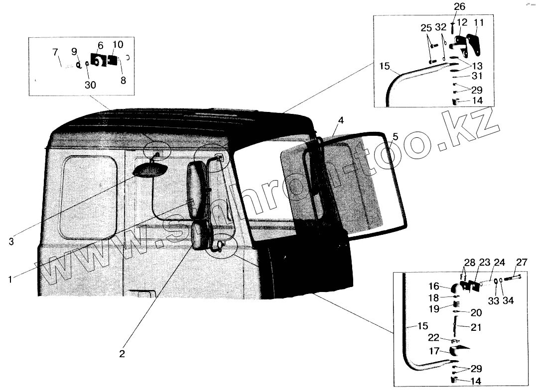 Каталог запасных частей к технике: МАЗ-543202. Установка стекол и зеркал на большую кабину