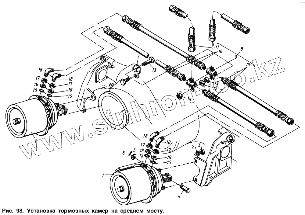 Каталог запасных частей к технике: МАЗ-54321. Установка тормозных камер на среднем мосту