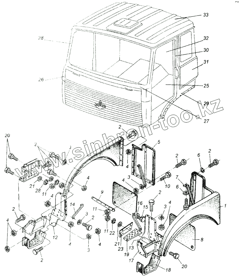 Каталог запасных частей к технике: МАЗ-54326. Кабина. Установка передних крыльев и подножек