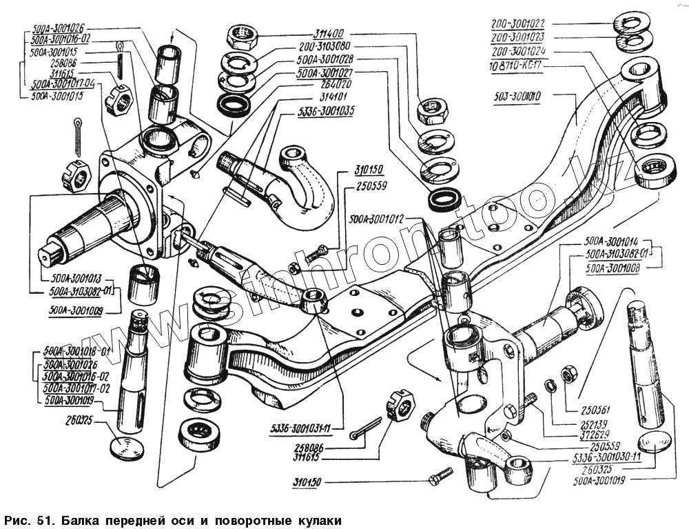 Каталог запасных частей к технике: МАЗ-54328. Балка передней оси и поворотные кулаки