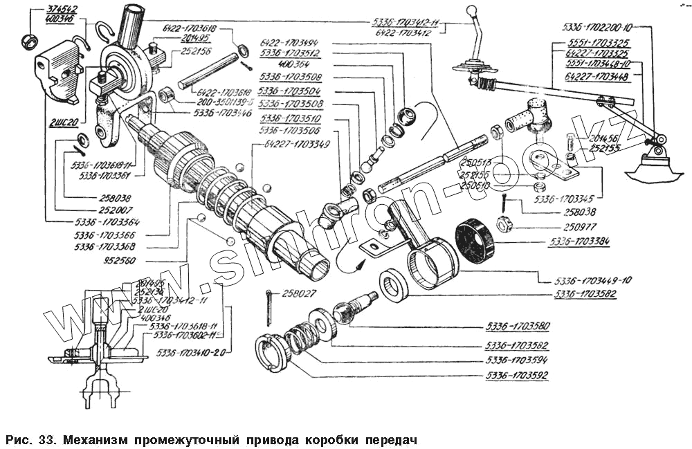 Каталог запасных частей к технике: МАЗ-54328. Механизм промежуточный привода коробки передач