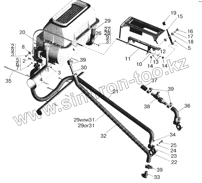 Каталог запасных частей к технике: МАЗ-5432. Установка шлангов и крана управления отопителем