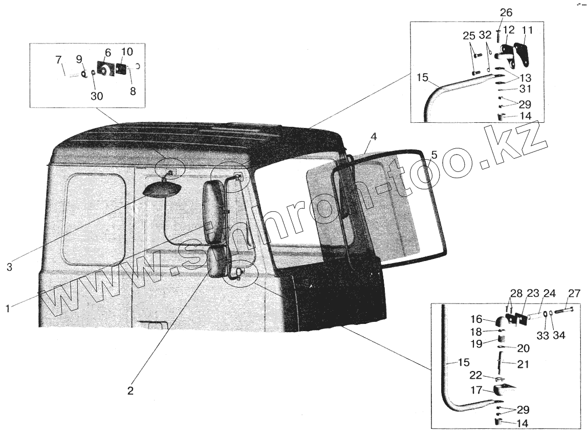 Каталог запасных частей к технике: МАЗ-5432. Установка стекол и зеркал на большую кабину