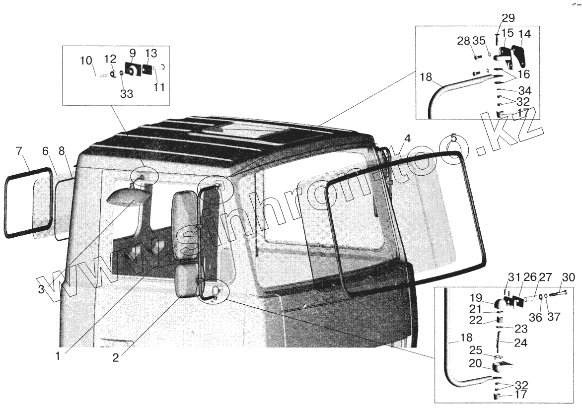 Каталог запасных частей к технике: МАЗ-5432. Установка стекол и зеркал на малую кабину