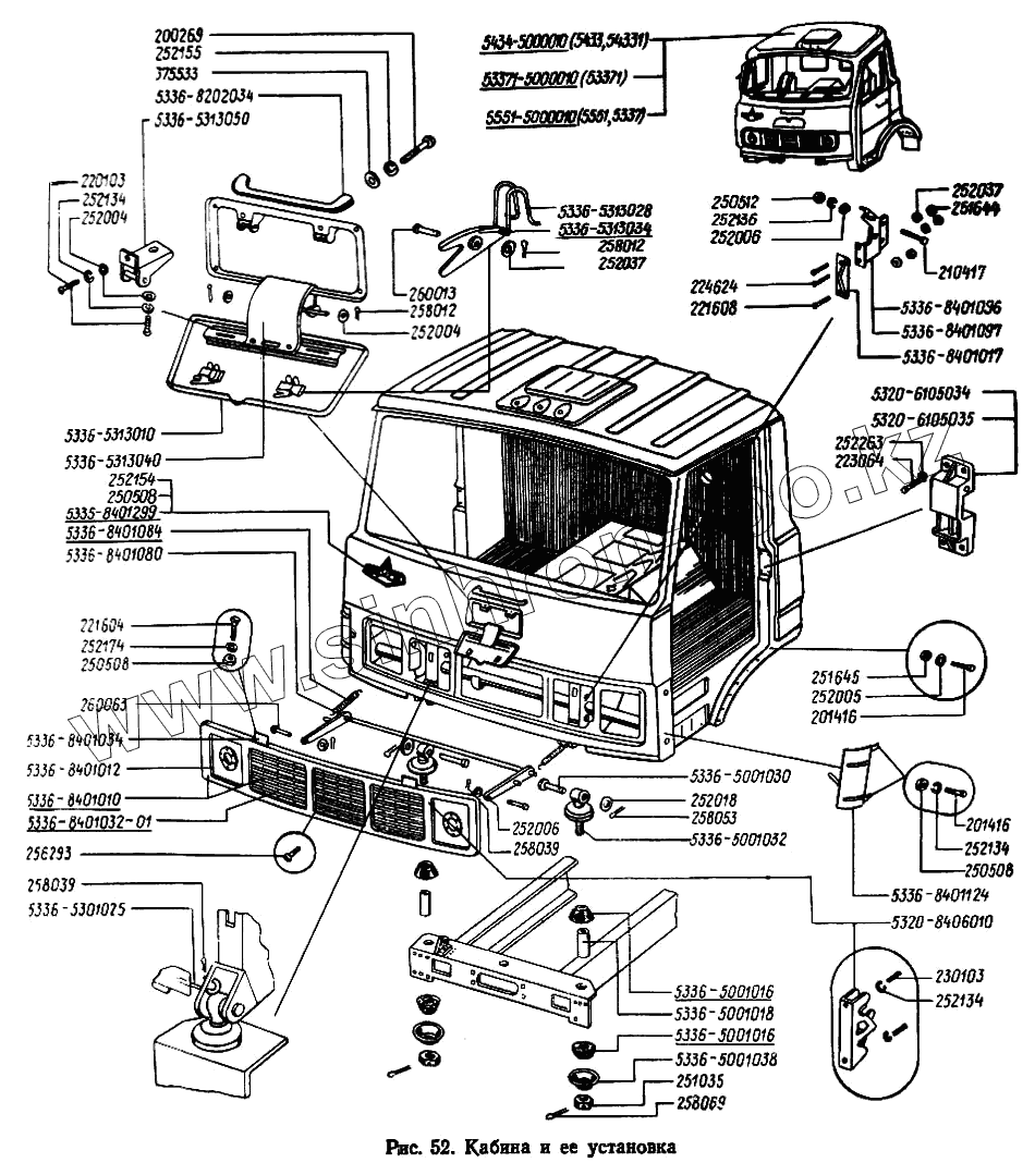 Каталог запасных частей к технике: МАЗ-5433. Кабина и ее установка