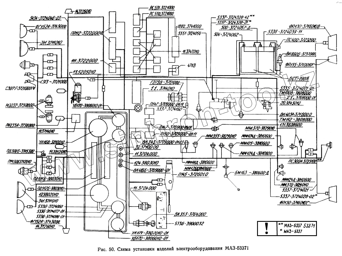 Каталог запасных частей к технике: МАЗ-5433. Схема установки изделий электрооборудования МАЗ-53371