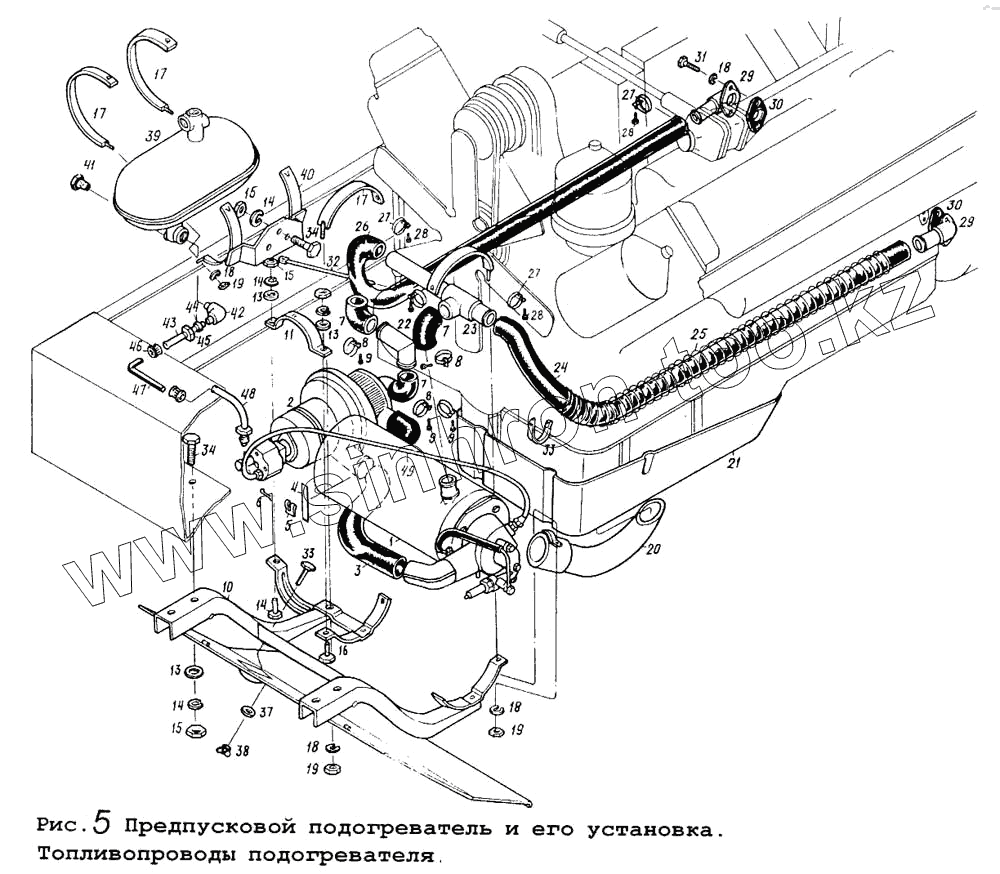 Каталог запасных частей к технике: МАЗ-5434. Предпусковой подогреватель и его установка. Топливопроводы подогревателя