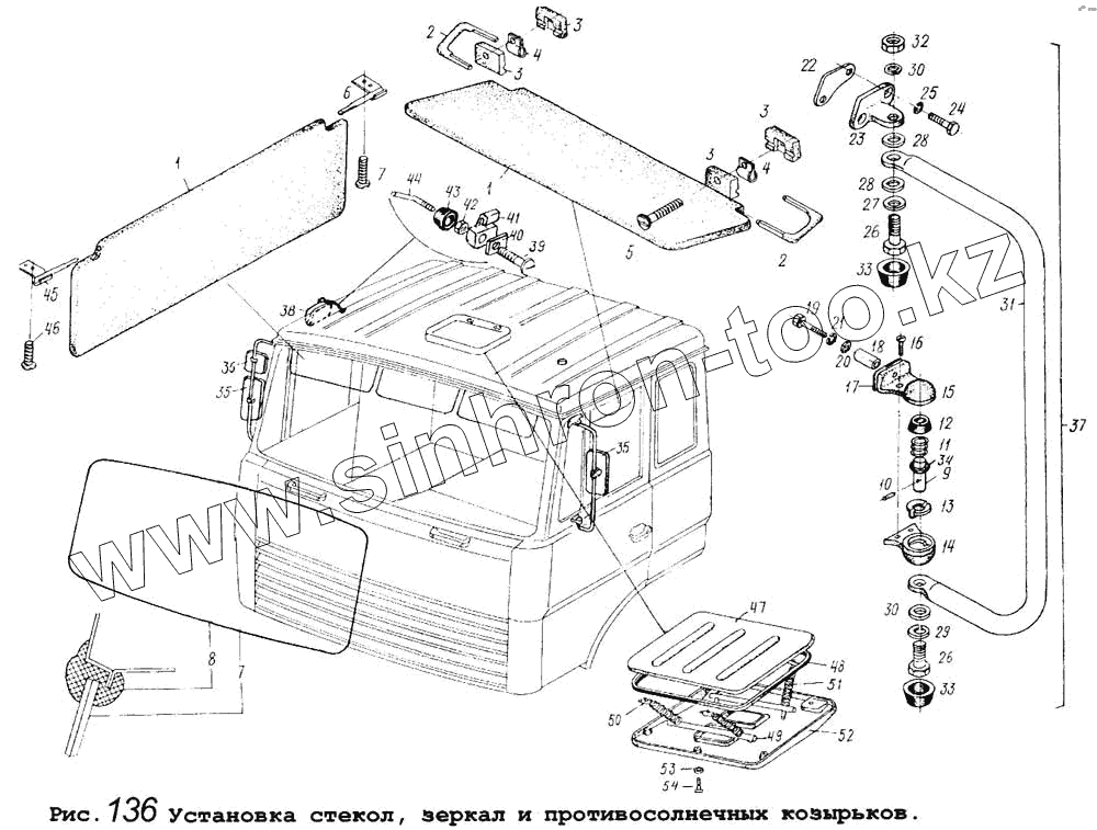 Каталог запасных частей к технике: МАЗ-5434. Установка стекол, зеркал и противосолнечных козырьков