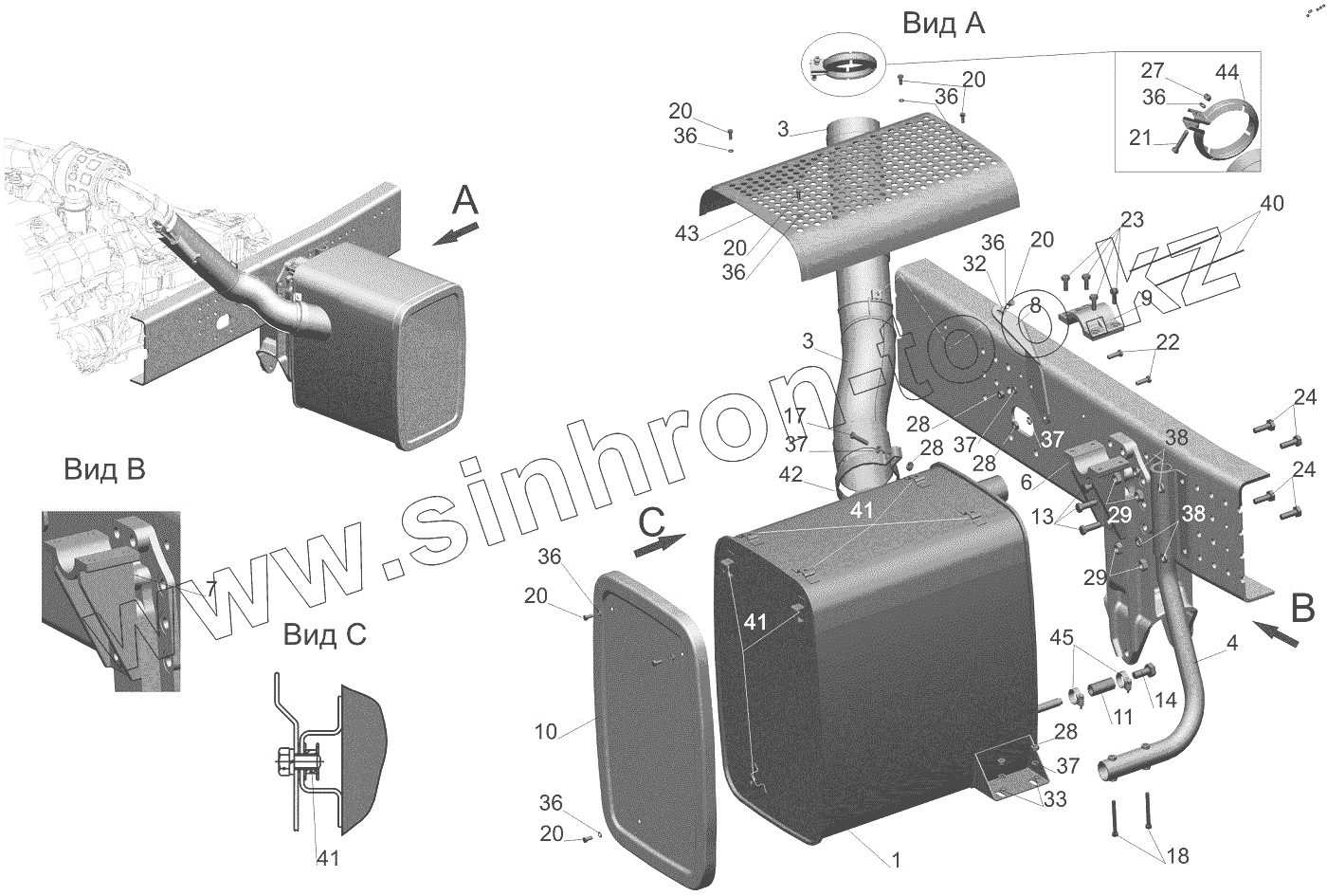 Каталог запасных частей к технике: МАЗ-544018. Установка системы выпуска газов 544018-1200001