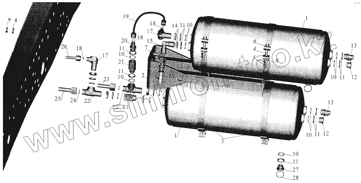 Каталог запасных частей к технике: МАЗ-544069. Установка ресиверов и присоединительной арматуры