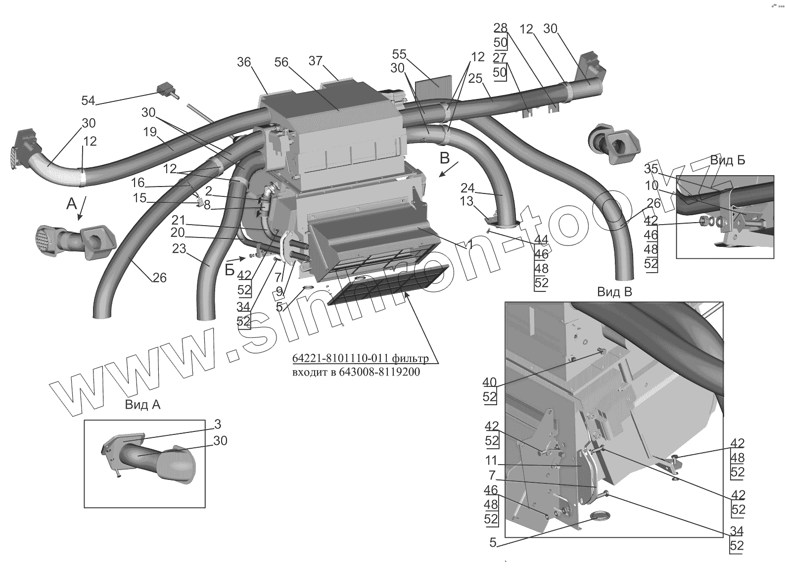 Каталог запасных частей к технике: МАЗ-5440B9, 6430B9. Установка отопителя 631019-8100001