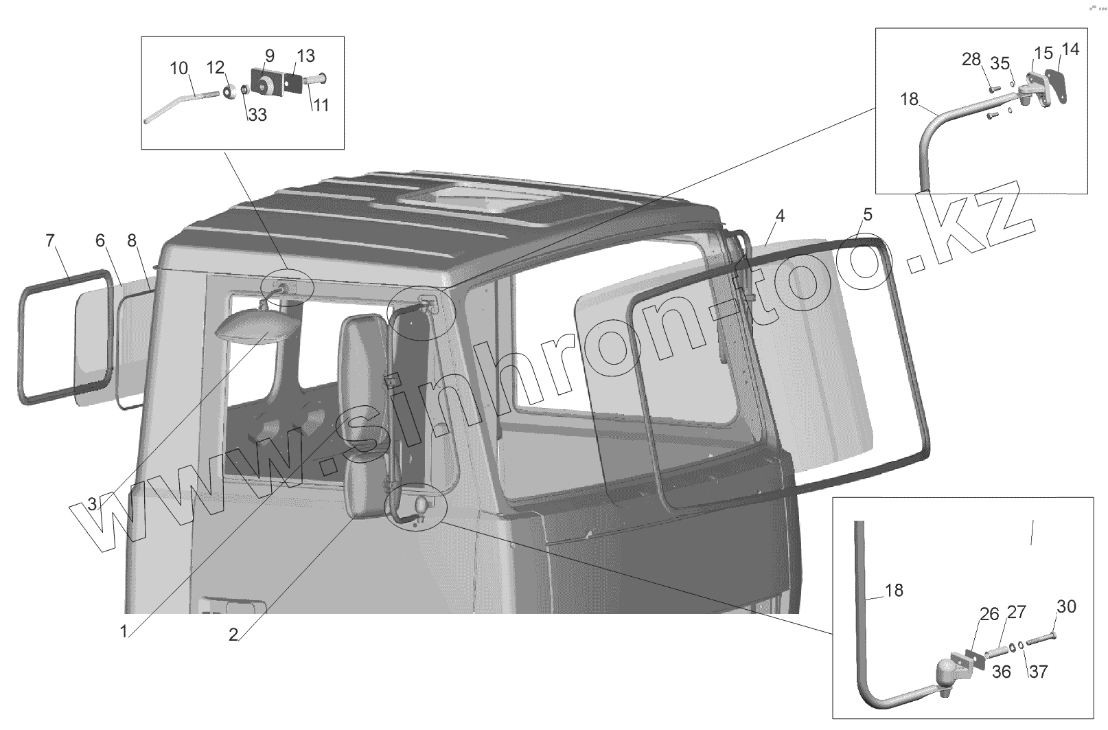 Каталог запасных частей к технике: МАЗ-551605. Установка стекол и зеркал на малую кабину