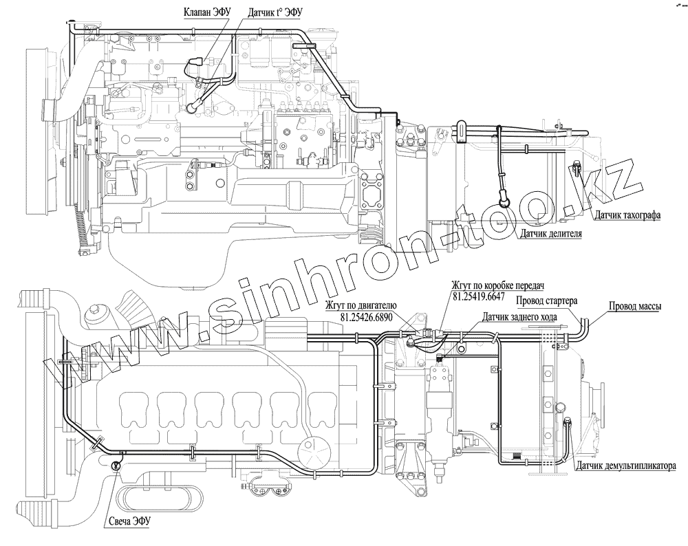 Каталог запасных частей к технике: МАЗ-551669. Монтаж жгута по двигателю