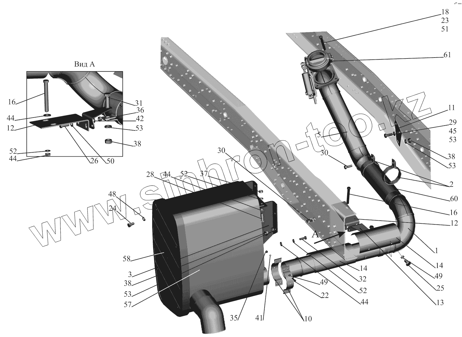 Каталог запасных частей к технике: МАЗ-551669. Установка системы выпуска газов 551669-1200001-010