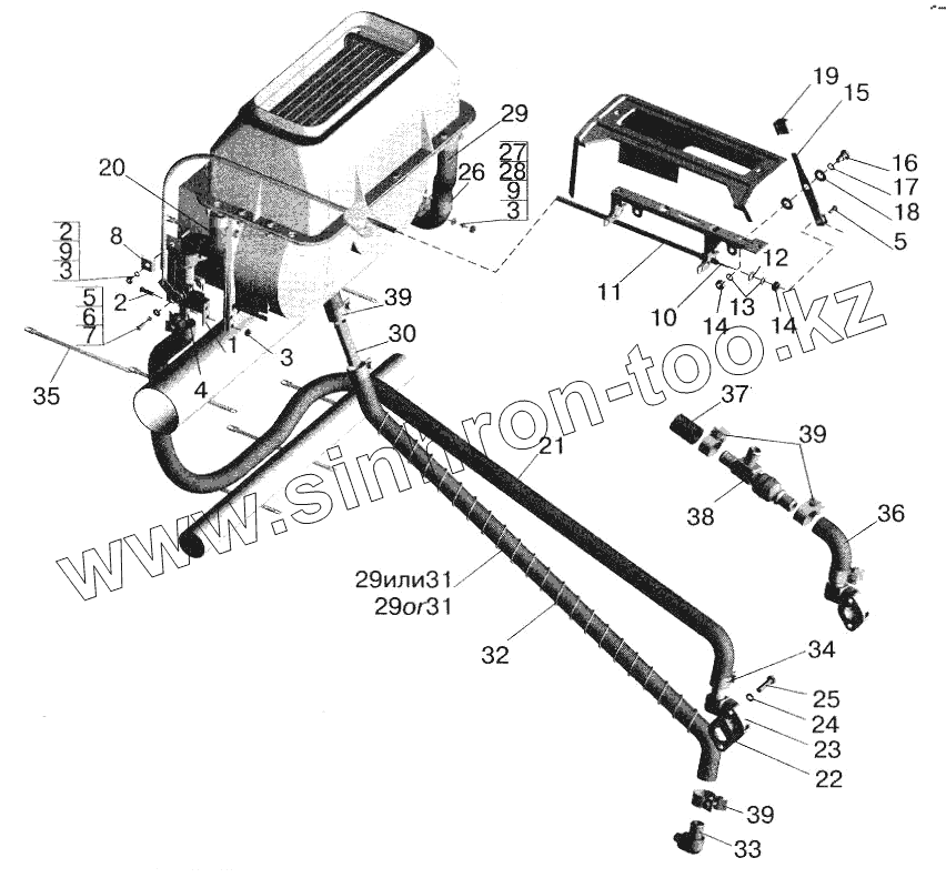 Каталог запасных частей к технике: МАЗ-5516 (2003). Установка шлангов и крана управления отопителем