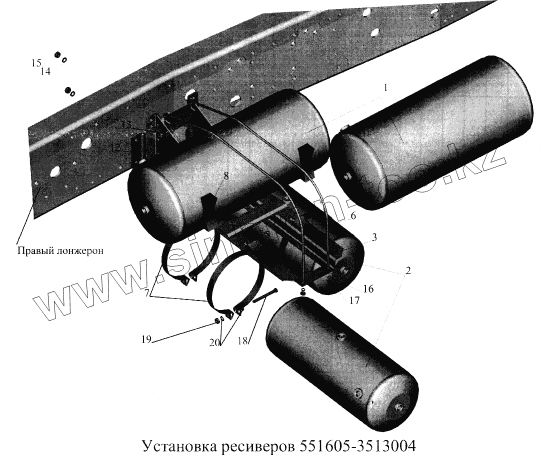Каталог запасных частей к технике: МАЗ-5516А5. Установка ресиверов 551605-3513004