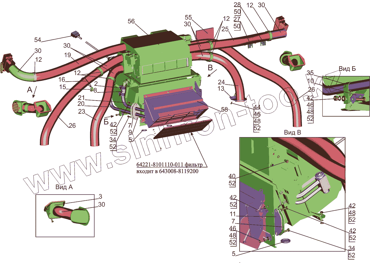Каталог запасных частей к технике: МАЗ-5550V3 (V5). Установка отопителя 631019-8100001