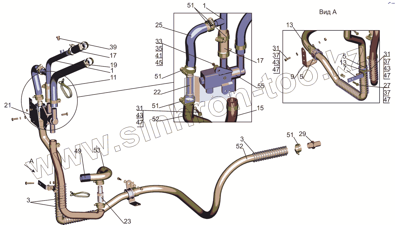 Каталог запасных частей к технике: МАЗ-5550V3 (V5). Установка шлангов отопителя 5340V4-8100006-020