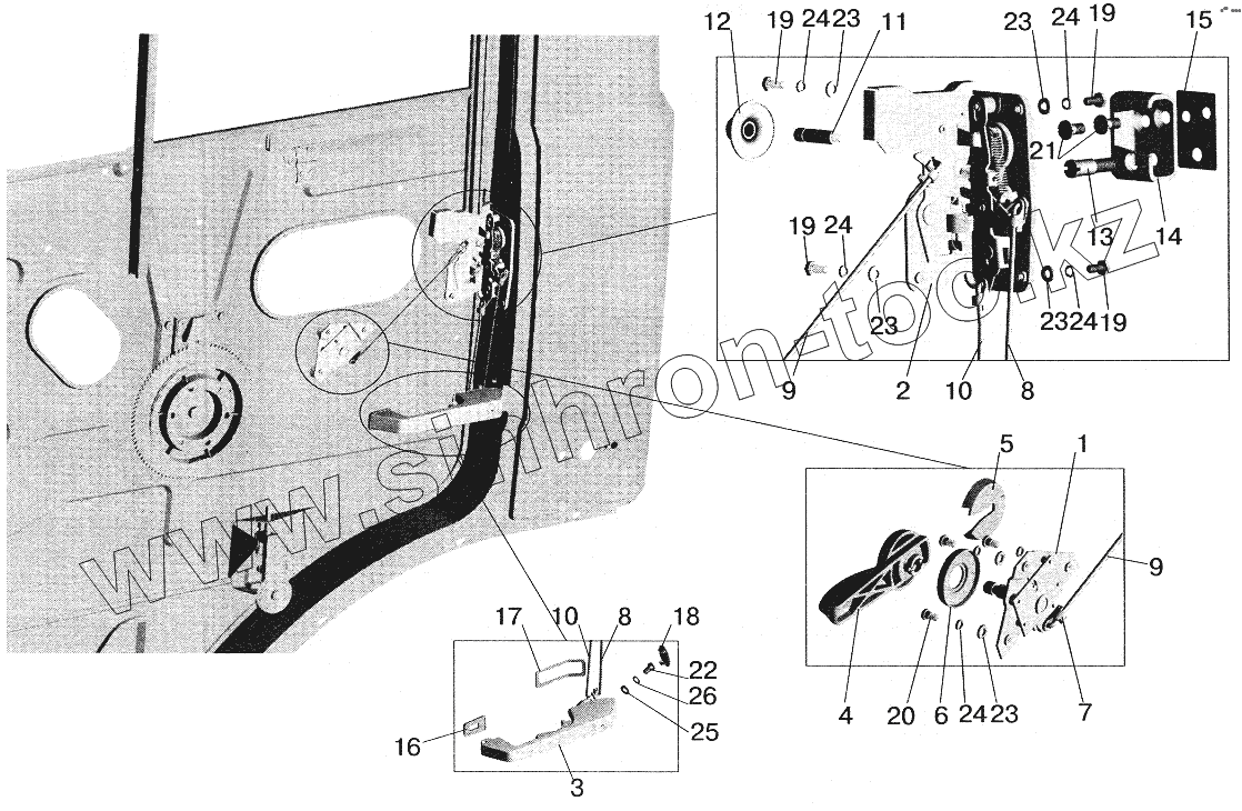 Каталог запасных частей к технике: МАЗ-5551 (2003). Установка наружной ручки и замка двери
