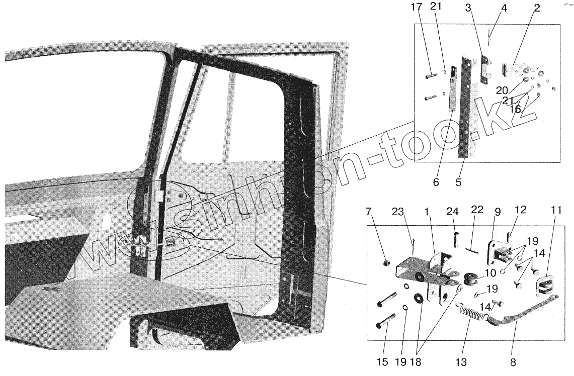 Каталог запасных частей к технике: МАЗ-5551 (2003). Установка ограничителя и петель двери