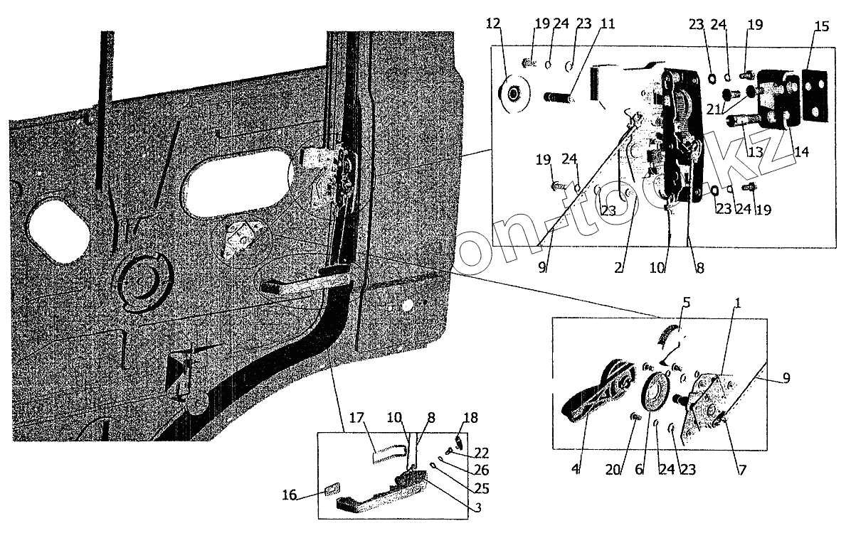 Каталог запасных частей к технике: МАЗ-6303 (2005). Установка наружной ручки и замка двери
