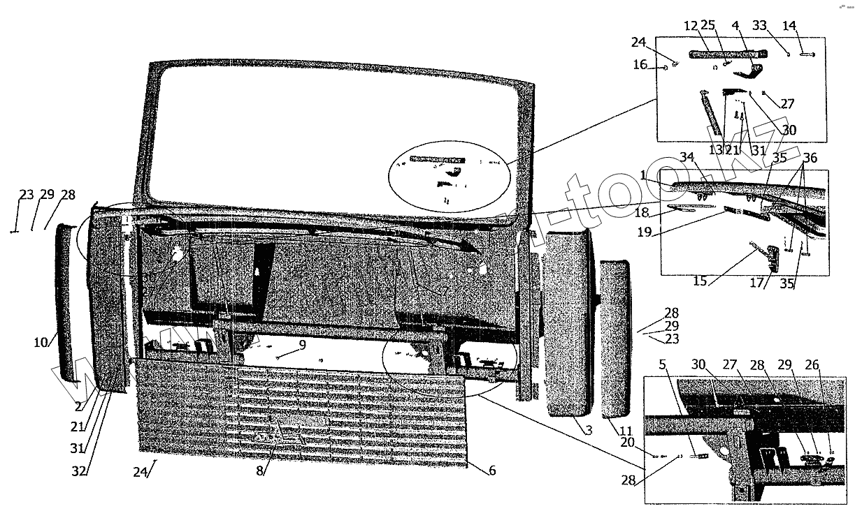 Каталог запасных частей к технике: МАЗ-6303 (2005). Установка облицовки и боковых щитков