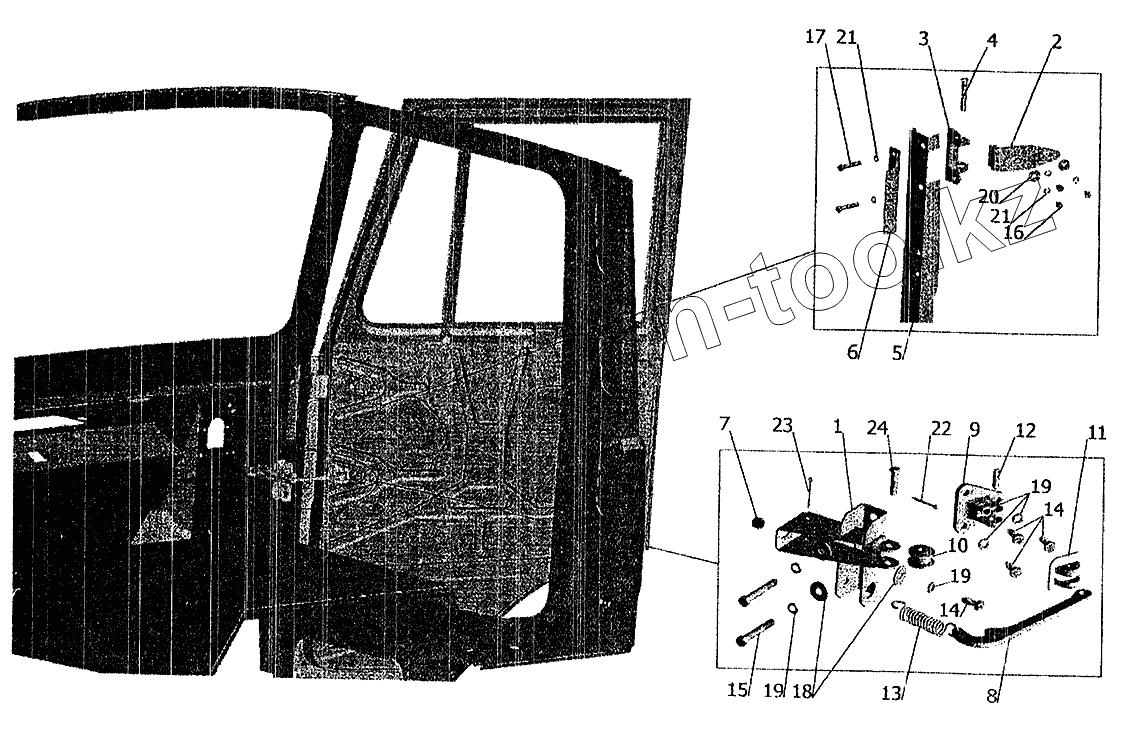Каталог запасных частей к технике: МАЗ-6303 (2005). Установка ограничителя и петель двери