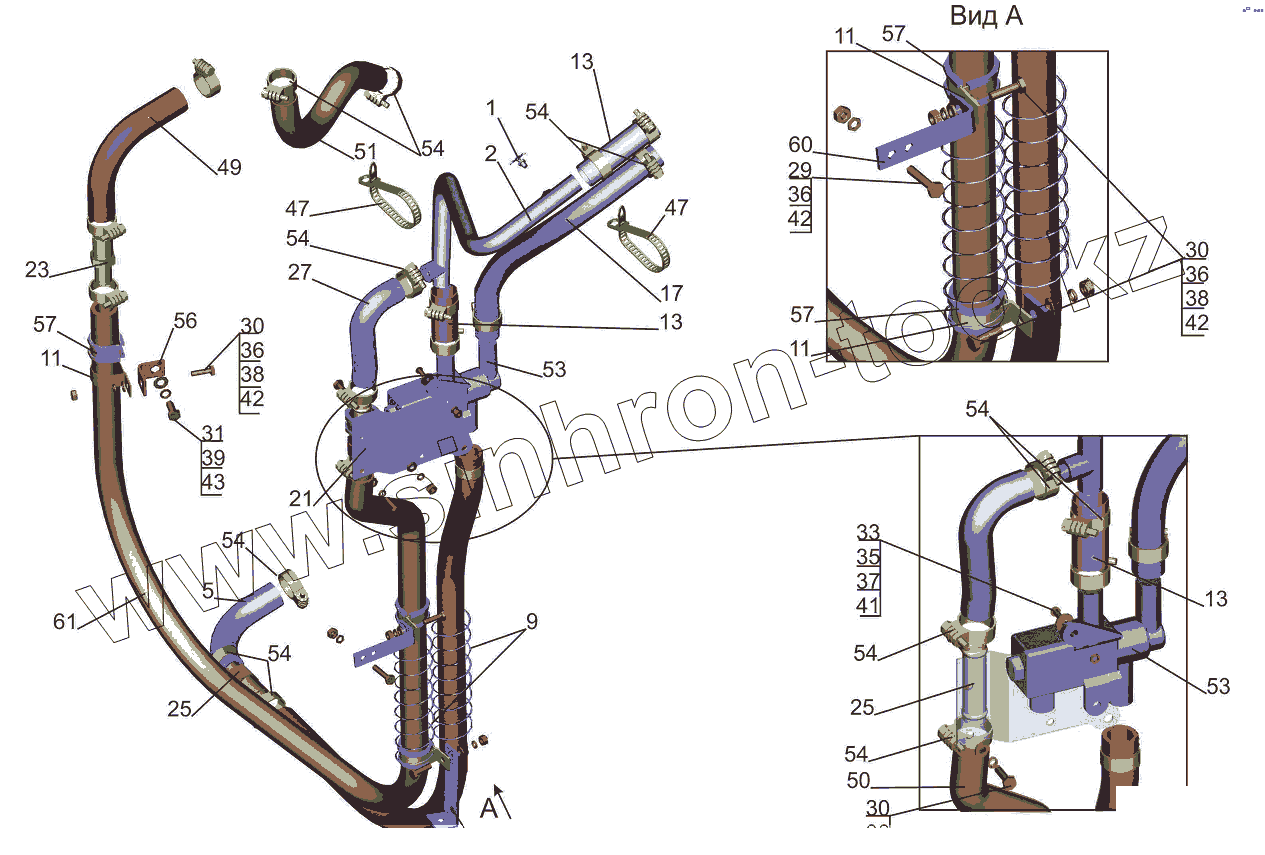 Каталог запасных частей к технике: МАЗ-631019. Установка шлангов отопителя 544019-8100006-020