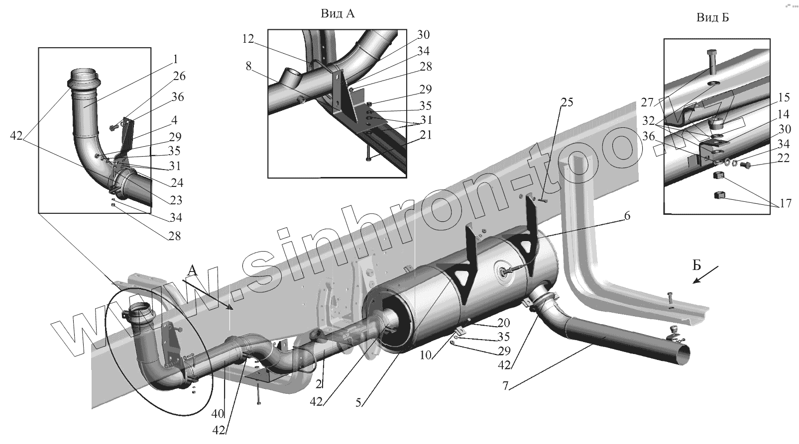 Каталог запасных частей к технике: МАЗ-631236. Установка системы выпуска 555035-1200001