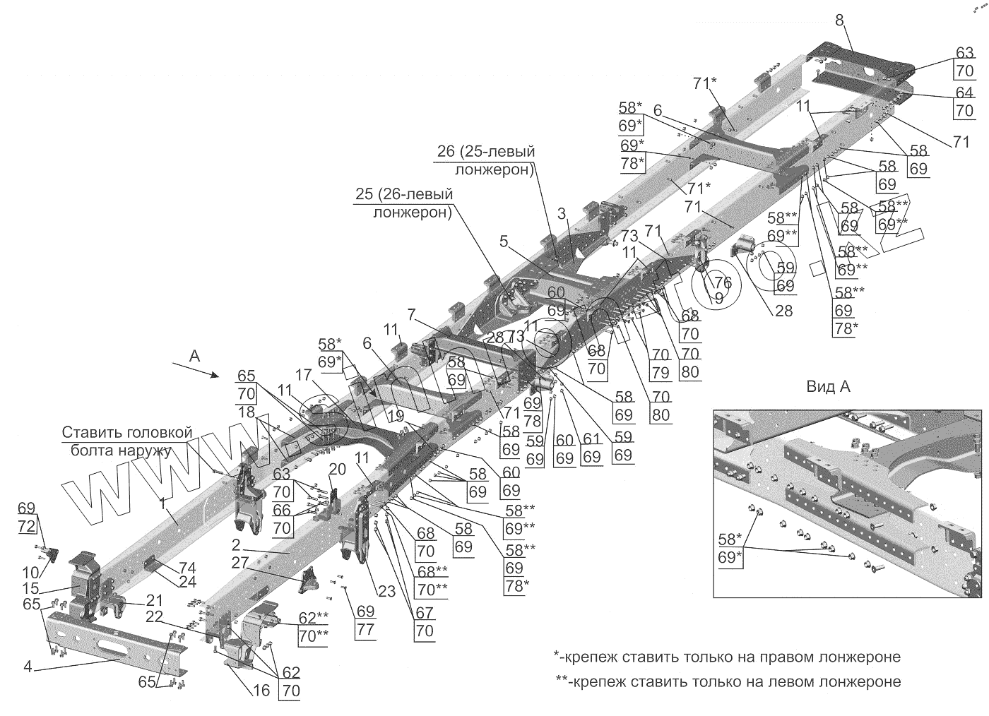 Каталог запасных частей к технике: МАЗ-6312B9-0008425-012. Рама 6312B9-2801002-020