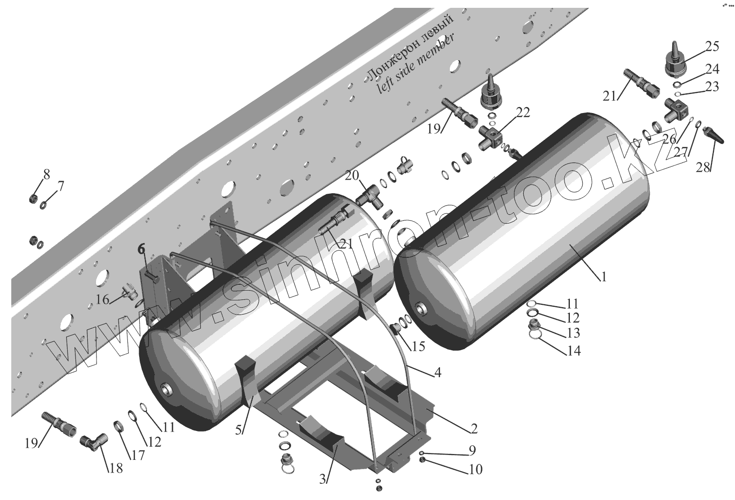 Каталог запасных частей к технике: МАЗ-631705. Установка ресиверов 631708-3513004 и присоединительной арматуры