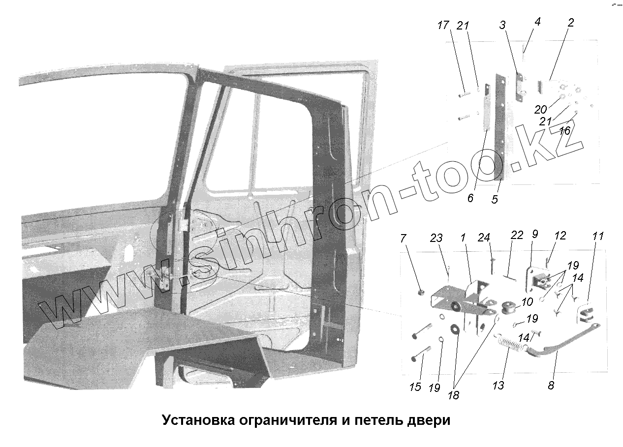 Каталог запасных частей к технике: МАЗ-631705, 631708. Двери\Установка ограничителя и петель двери