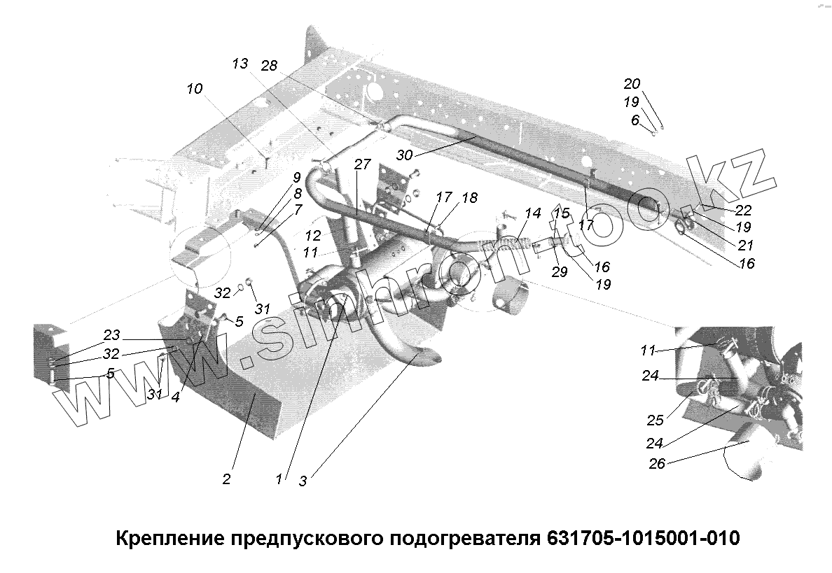 Каталог запасных частей к технике: МАЗ-631705, 631708. Крепление предпускового подогревателя 631705-1015001-010