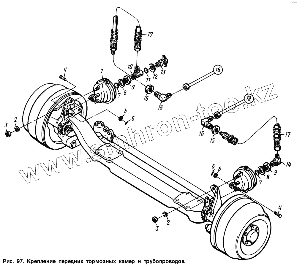 Каталог запасных частей к технике: МАЗ-64221. Крепление передних тормозных камер и трубопроводов
