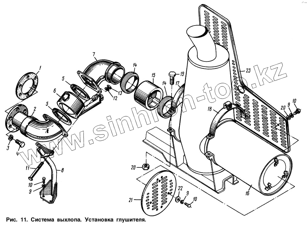 Каталог запасных частей к технике: МАЗ-64221. Система выхлопа. Установка глушителя