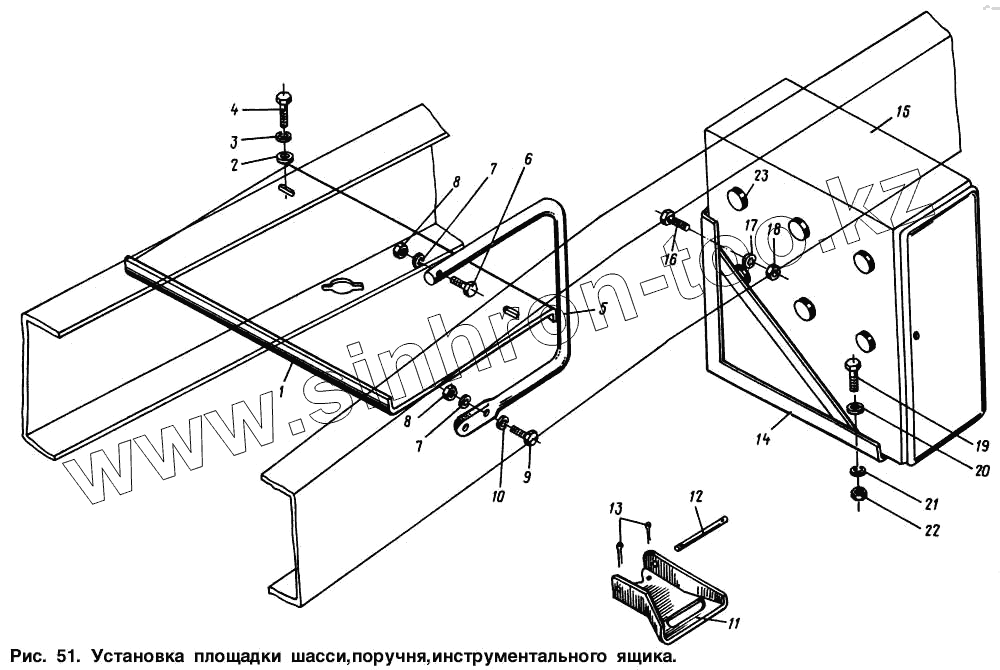 Каталог запасных частей к технике: МАЗ-64221. Установка площадки шасси, поручня, инструментального ящика