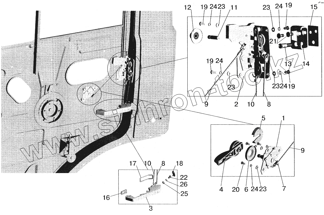 Каталог запасных частей к технике: МАЗ-6422. Установка наружной ручки и замка двери