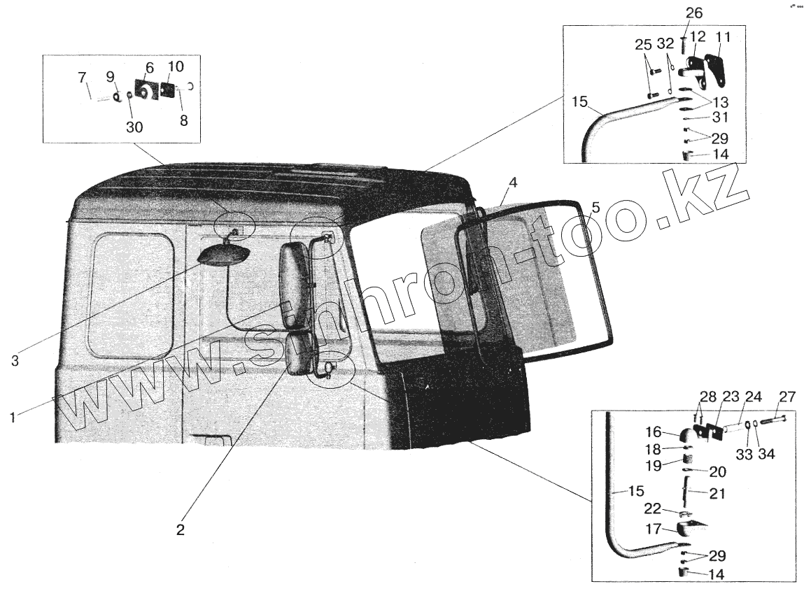 Каталог запасных частей к технике: МАЗ-6422. Установка стекол и зеркал на большую кабину