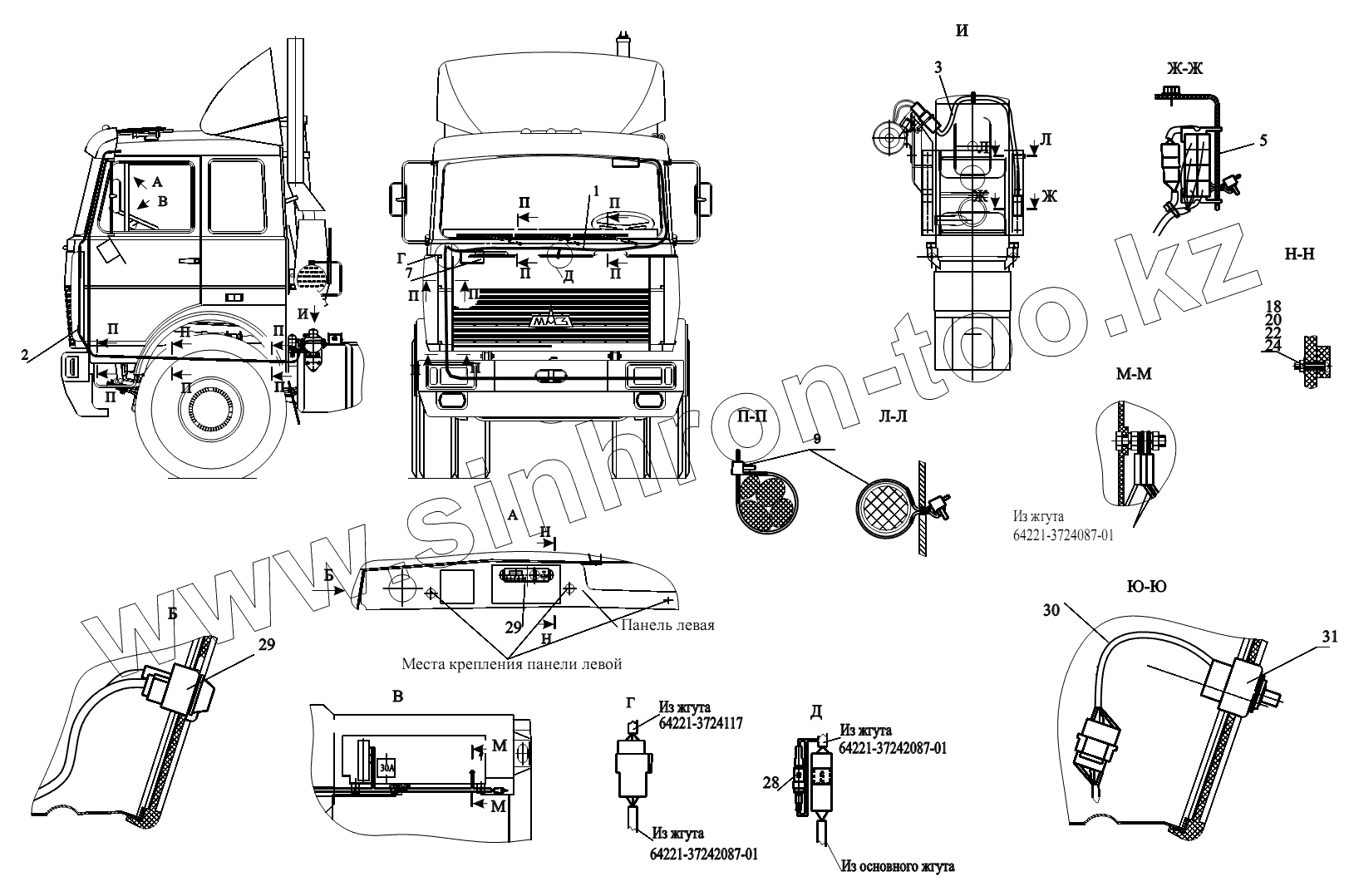 Расположение разъемов и элементов электрооборудования на шасси автомобилей (с гидроотбором)