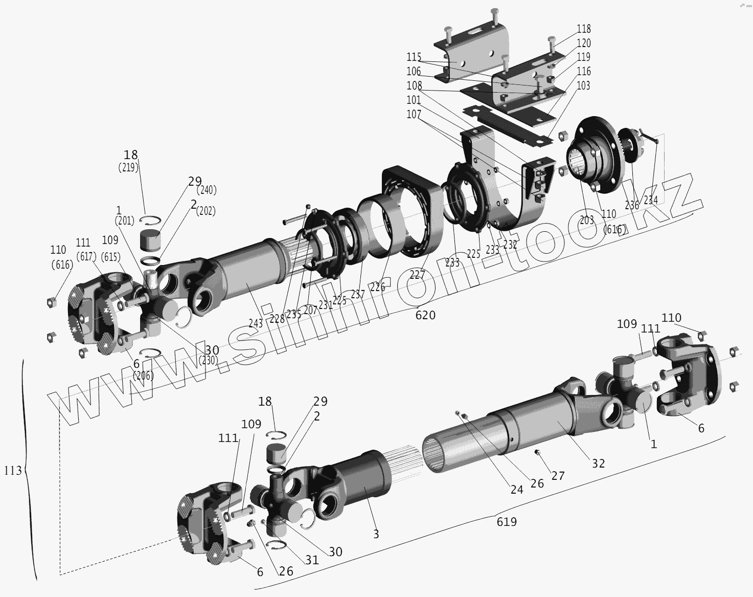 Карданный вал в сборе привода среднего моста