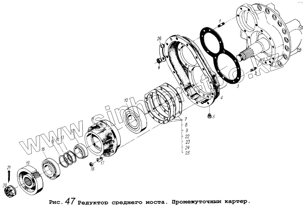 Каталог запасных частей к технике: МАЗ-64255. Редуктор среднего моста. Промежуточный картер
