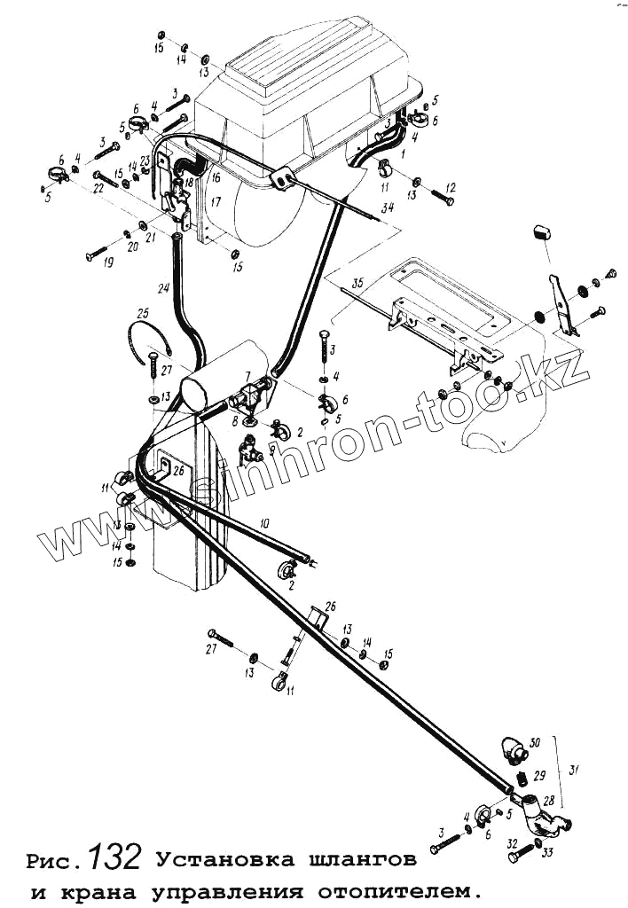 Каталог запасных частей к технике: МАЗ-64255. Установка шлангов и крана управления отопителем